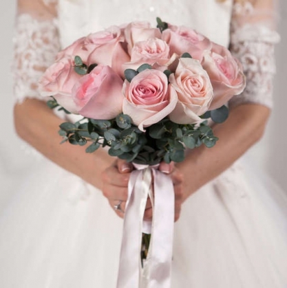 Классическое сочетание роз и эвкалипта в ароматном букете невесты. Бутоньерка и пакет лепестков в подарок!
